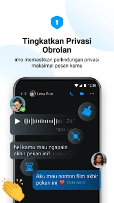Privasi Anda adalah prioritas utama imo. Nikmati fitur-fitur canggih seperti Pesan Menghilang, Obrolan Privasi, Perlindungan Layar, dan Enkripsi End-to-End yang menjaga setiap pesan Anda tetap rahasia. Kontrol penuh ada di tangan Anda, dari menghapus pesan, mengatur waktu tampilnya, hingga memblokir tangkapan layar atau penerusan. Tak hanya itu, imo dilengkapi fitur terjemahan pesan instan, membuka pintu komunikasi lintas bahasa yang mulus. Jelajahi juga VoiceClub, ruang virtual tempat Anda dapat bergabung atau membuat komunitas, berbagi bakat, berdiskusi, atau sekadar bersenang-senang dengan teman dan keluarga dalam berbagai acara interaktif. imo dirancang untuk pengalaman berkomunikasi yang aman, lancar, dan menyenangkan.